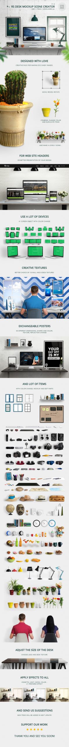 RS Desk Mockup Scene Creator is a creative suite of over 280 objects that will help you to create a beautiful work desk scene. Full layered PSD Photoshop file with resolution of 5000×3000 pixels contain excellent isolated objects and items, which you can move, rotate, reduce and change their color.